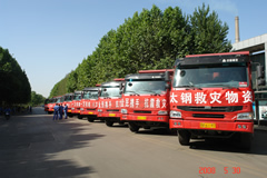 2008年5月30日,我公司選派3公司10臺豪沃8X4自卸車,承擔了太鋼支援甘肅地震災區700頂帳篷等物資的緊急運送任務。